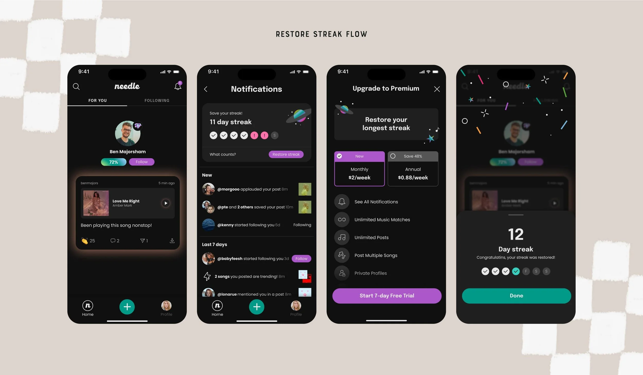 When I first joined Needle, the product was already live but struggling to gain traction. It was overly complex, visually inconsistent, and hard to use. I worked closely with cofounders Mik and Wyatt for over two years to reimagine the entire experience from the ground up. Needle is a social music app that combines the best of Spotify and Instagram, letting people share songs they love and connect through music. Users can post tracks, comment, applaud, and save songs, creating a fun and personal space for discovery and connection.