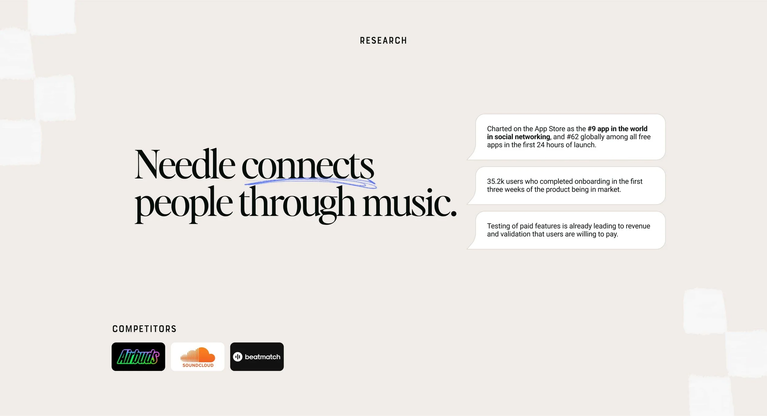 My work included UX strategy, marketing page design, UX and UI design, custom illustrations, design system creation, pitch deck design, and engineering handoff. Collaborating with Mik and Wyatt was an incredible experience. Together we transformed Needle into a clean, intuitive, and engaging platform that makes music feel social again.